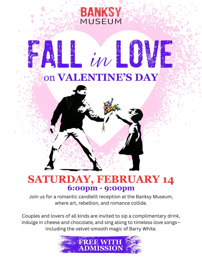 Join us for a romantic candlelit reception at the Banksy Museum, where art, rebellion, and romance collide. Couples and lovers of all kinds are invited to sip a complimentary drink, indulge in cheese and chocolate, and sing along to timeless love songs—including the velvet-smooth magic of Barry White.