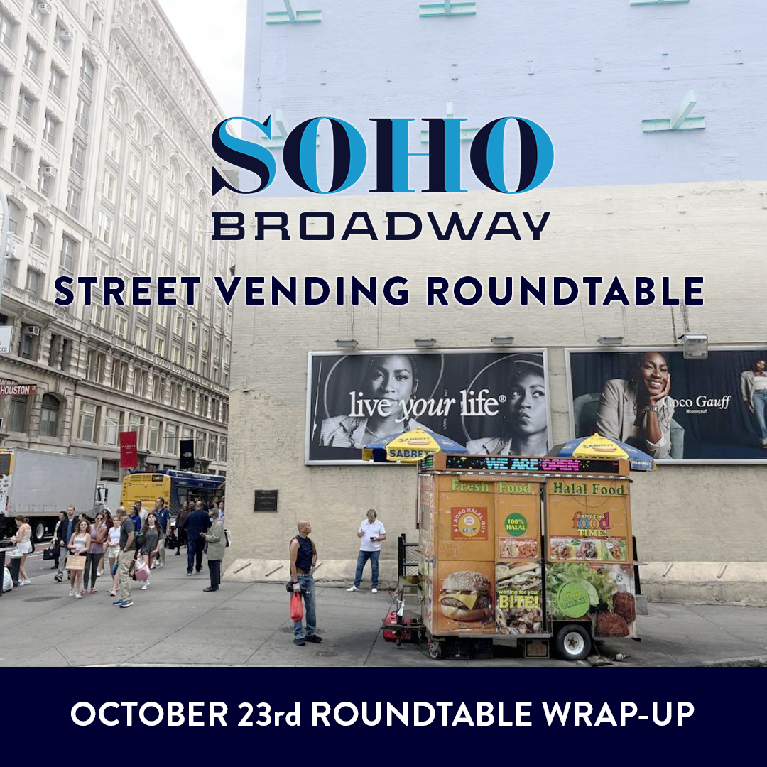 On Thursday, October 23rd, the SoHo Broadway Initiative hosted a roundtable via Zoom with key agencies and elected officials’ offices to educate the community and discuss the challenges presented in regard to street vending enforcement in the SoHo Broadway district. Initiative staff shared our organization’s challenges and successes and offered an opportunity for representatives of City agencies and the offices of elected officials to answer questions submitted by stakeholders.